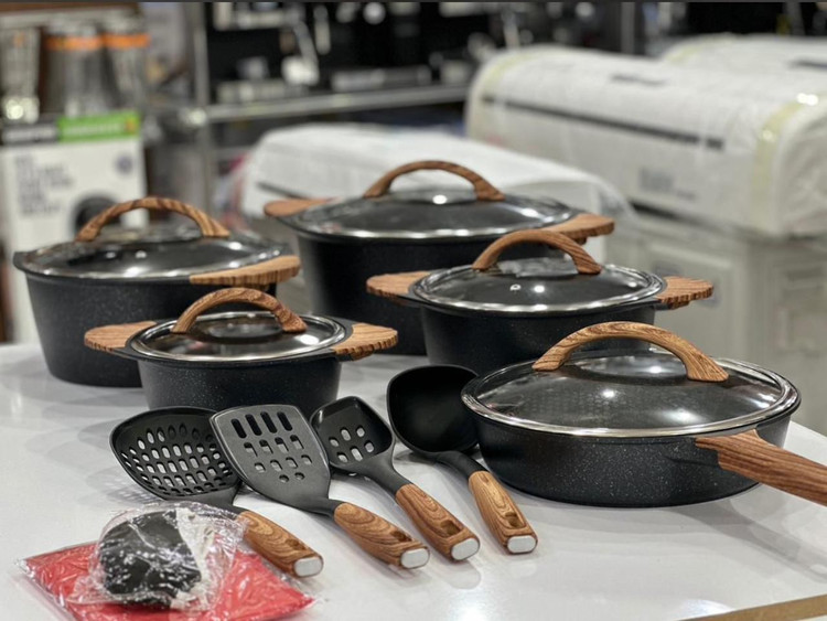 سرویس17 پارچه شامل: قابلمه 20 سانتیمتری (2.4 لیتر)، 24 سانتیمتری (4.4 لیتری)، 28 سانتیمتری (6.6 لیتری)، 32 سانتیمتری (9.6 لیتری), تابه عمیق 28 سانتیمتری (4 لیتری) و ۷عدد وسایل اشپزی